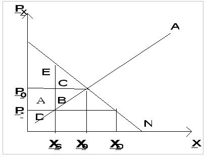 Die vormals dagewesene ökonomische Wohlfahrt (ABCDE) reduziert sich um die Flächen b und c auf die Fläche EAD.