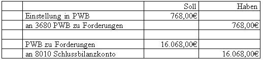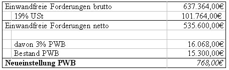 Das allgemeine Ausfallrisiko bei Kundenforderungen beträgt 3%. Der Bestand an einwandfreien Forderungen beträgt 637.364€ brutto, der Bestand an PWB 15.300€.