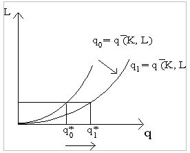 Technischer Fortschritt bewirkt eine Rechtsdrehung der Produktionsfunktion, mit dem gleichen Faktoreinsatz kann jetzt mehr produziert werden: